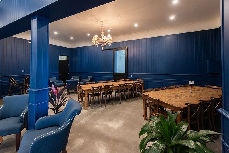 Stripping back to industrial concrete floors and exposed original brick work maintained the integrity and soul of the venue. Integrating new life to hotel is the brand new feature bar, with floor to ceiling feature tile, white powder coated gantry with timber shelves and epic blue paneling.